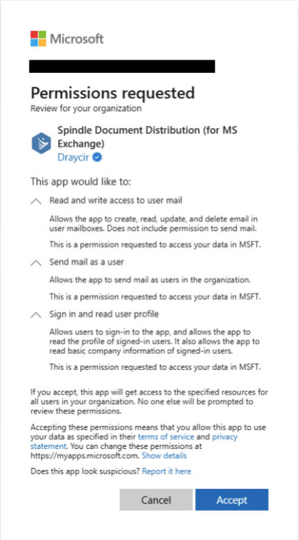 Note: These permissions are required solely to allow Spindle Document Distribution to send emails via Exchange Online